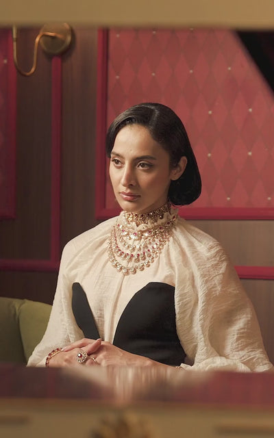 Polki diamond necklace set in 14kt gold with precious Emerald & pearls